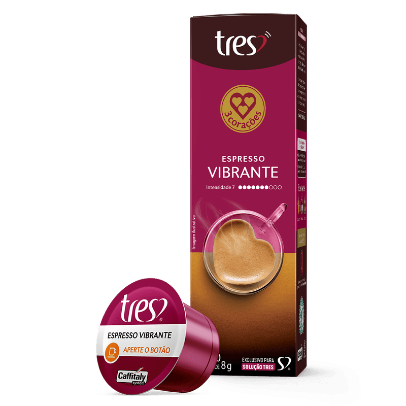 O Café Espresso Vibrante em cápsula TRES 3 Corações é a escolha ideal para quem busca um espresso de sabor marcante e qualidade excepcional. Feito com grãos arábica selecionados do Cerrado Mineiro e da Alta Mogiana Paulista, cultivados a 900 metros de altitude, este blend apresenta intensidade 7, corpo encorpado e notas de chocolate e caramelo. Com sua doçura natural e sabores intensos, é perfeito para uma experiência aromática única.